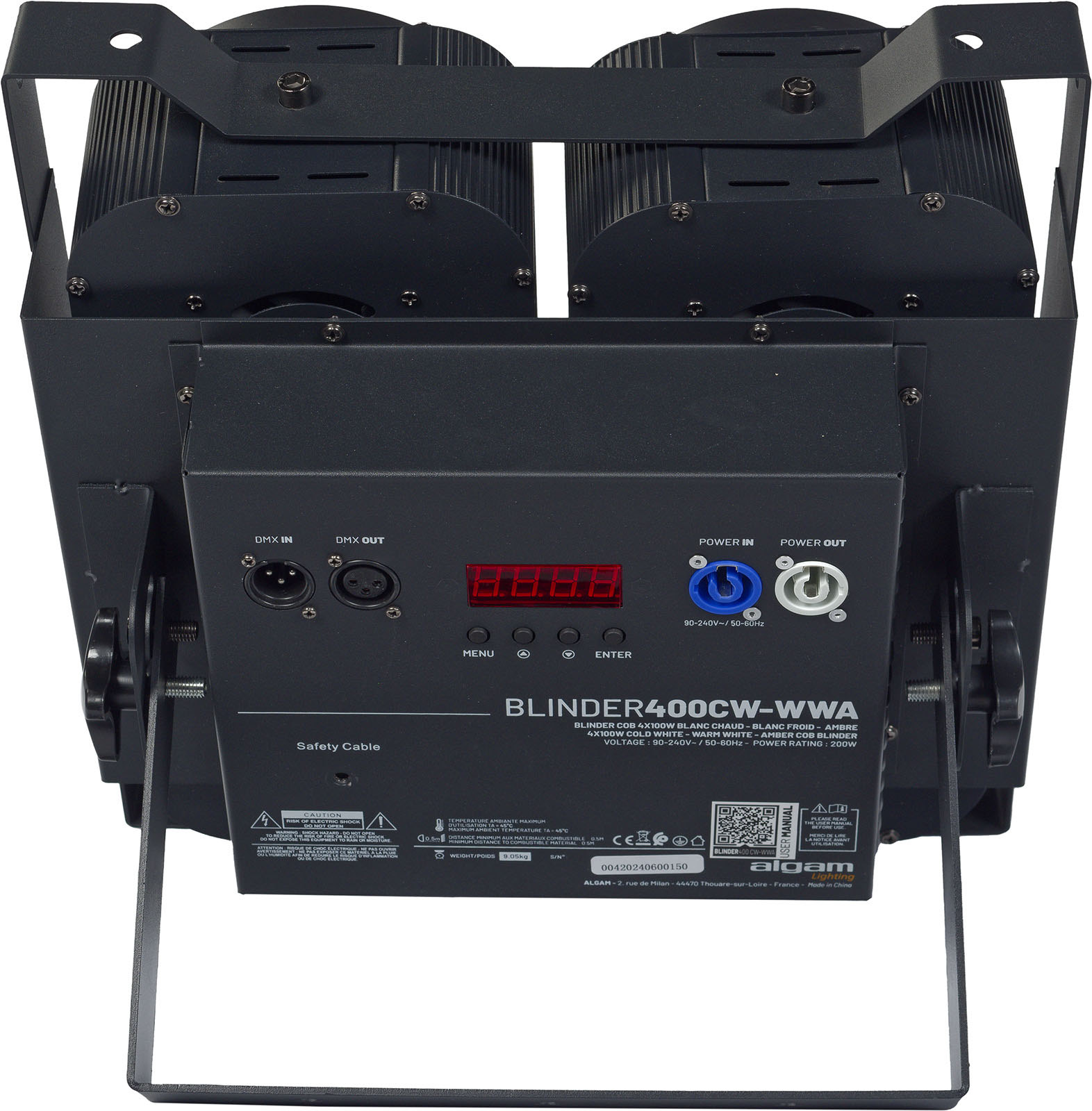 Vous êtes à la recherche d'un système lumière puissant, capable de créer cet effet blinder lumineux éblouissant en fond de scène ? Le BLINDER 400 CW-WWA d'Algam Lighting est le produit qu'il vous faut ! Conçu autour de 4 puissantes LED COB de 100W, ce blinder impressionnant est capable de générer une palette de blanc allant du blanc froid aux teintes chaudes ambrées similaire aux anciennes lampes halogènes grâce à l'association de LED blanc froid/blanc chaud/ambre. Contrôlable en DMX via 7 ou 16 canaux, le BLINDER 400 CW-WWA autorise un réglage individuel précis de l'intensité et de la couleur de chacune des LED, et propose différents effets pour plus de polyvalence.