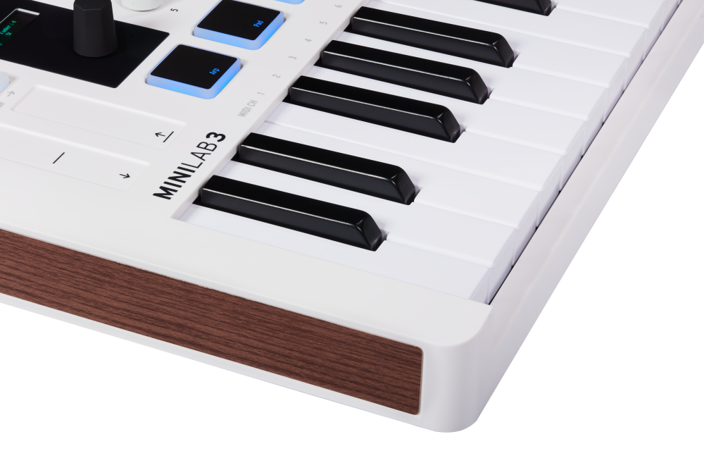 Le MiniLab 3 s'intègre parfaitement dans tous les environnements, de votre chambre à la scène, grâce à son design compact et léger, à son intégration avancée avec les DAW et à sa connectivité MIDI out et USB-C. Conçu pour la durabilité et la longévité, il offre une construction robuste adaptée aux déplacements, une garantie de 5 ans, un matériau plastique recyclé à 50 % minimum et un emballage entièrement recyclé, faisant du MiniLab 3 un contrôleur respectueux de l'environnement.