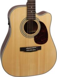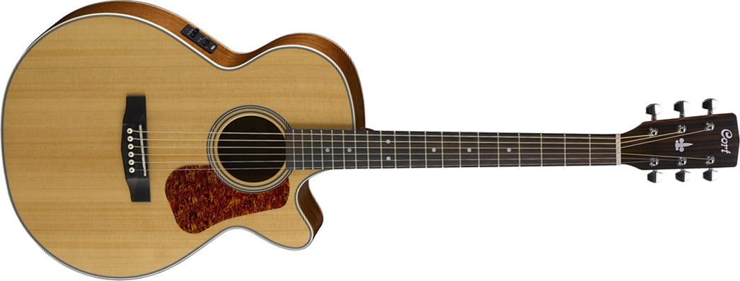 La CORT Luce L100F Natural Satin est une guitare folk électro-acoustique compacte de type Concert, dotée d'une table en Epicéa massif, d'une caisse en Acajou laminé, et d'une touche en Ovangkol.