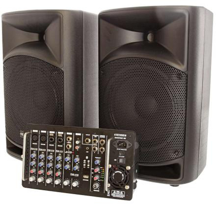 Il est composé de 2 enceintes et d'une table de mixage détachable qui se loge derrière une des enceintes.