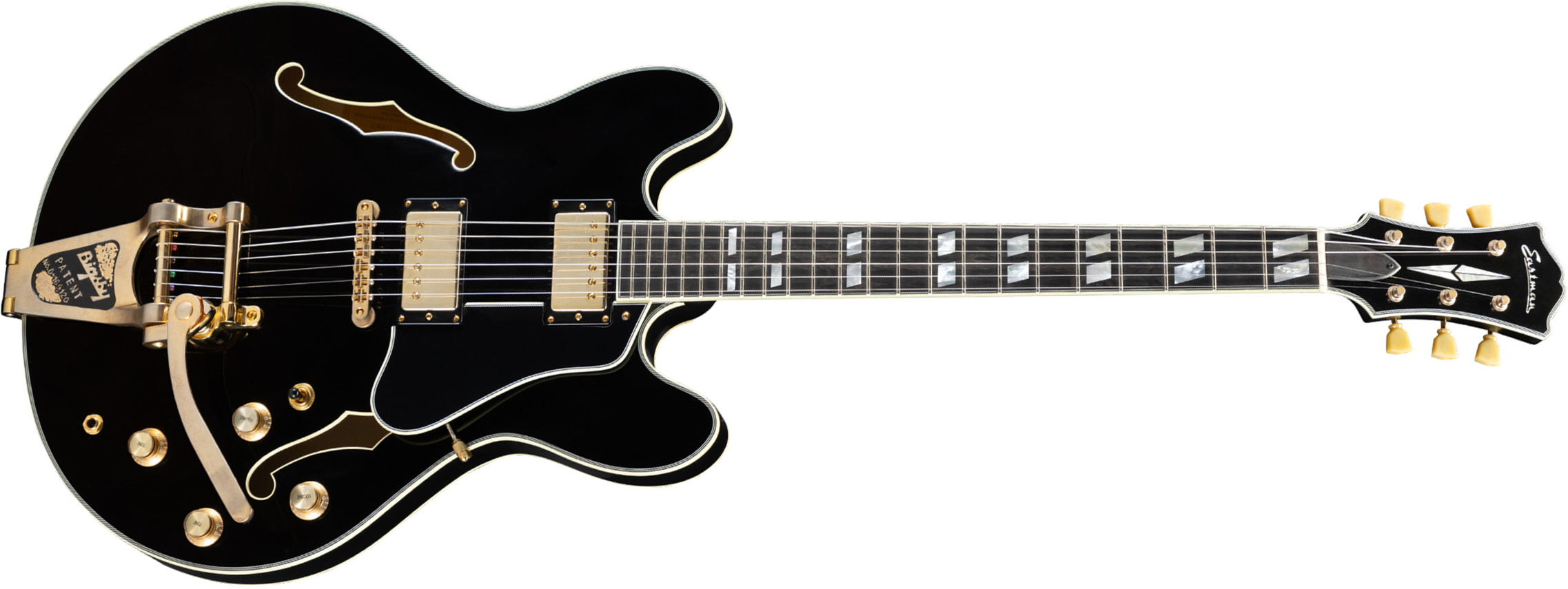 Edition limitée. Ostensiblement inspirée d'un modèle américain de référence, l'EASTMAN Limited Edition T59/TV-B (Truetone Vintage Gloss Black), est une guitare électrique semi-hollow body (avec bloc central sustain/anti-feedback) de haute qualité, équipée d'une table et d'une caisse en Erable flammé laminé, d'un manche collé en Erable, d'une touche en Ebène, de micros double bobinage Lollar custom et d'un vibrato Bigsby B7.
