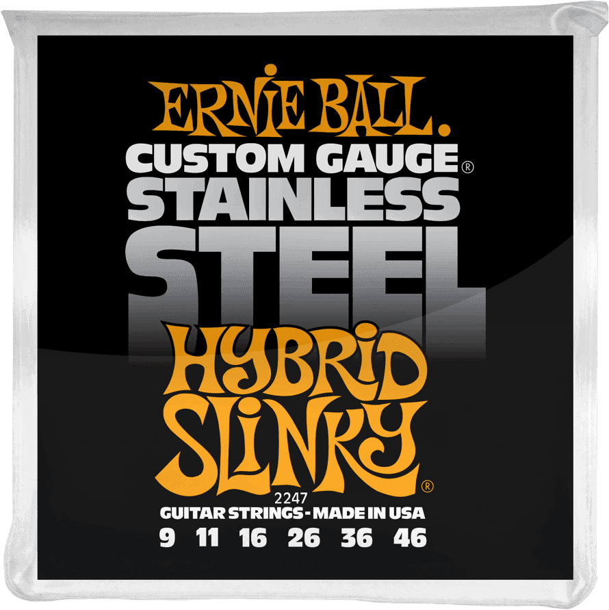 Jeu de six cordes pour guitares électrique ERNIE BALL 2247 Slinky Electrique (stainless steel) Hybrid tirant : 9-11-16-26-36-46 pour un son brillant à petit prix !