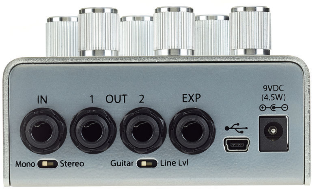 - Commutateur Aux pour la fonction Tap-Tempo ou triple commutateur Aux pour des changements de presets faciles (Up/Down/Load)