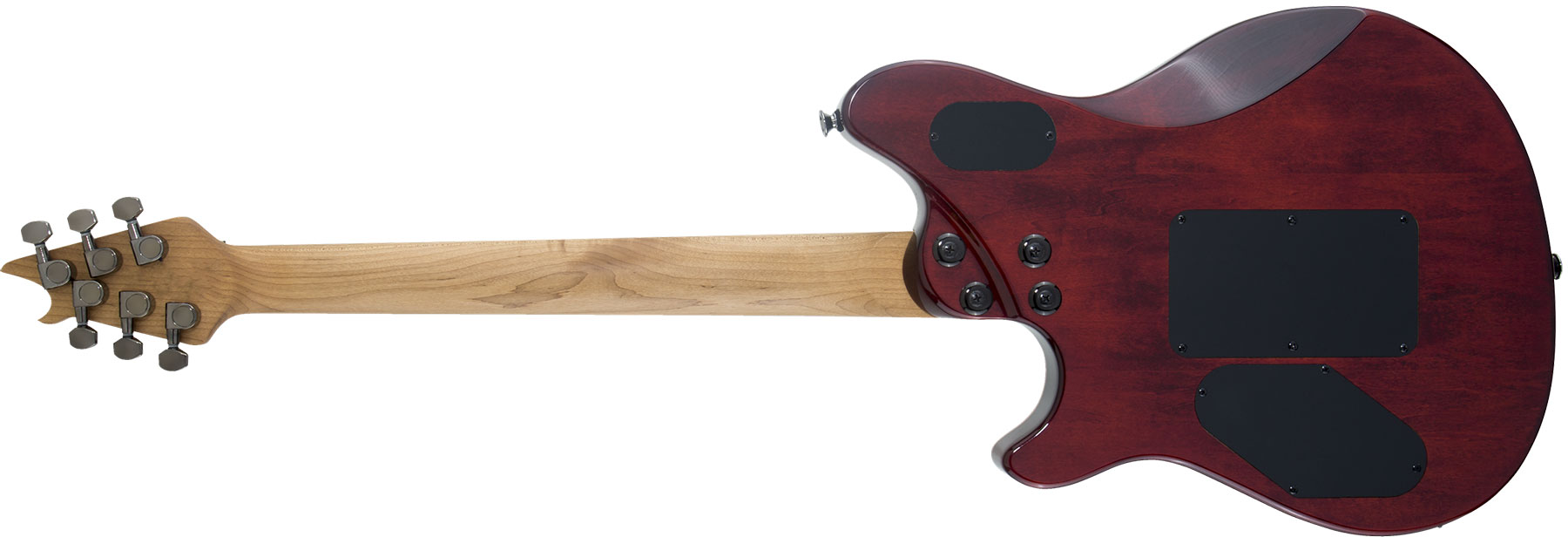 Corps en Tilleul, manche vissé et touche en Erable, diapason 25,50 type Fender Stratocaster, 22 frettes jumbo, micros Direct Mounted EVH Wolfgang, vibrato double blocage EVH sous license Floyd Rose.