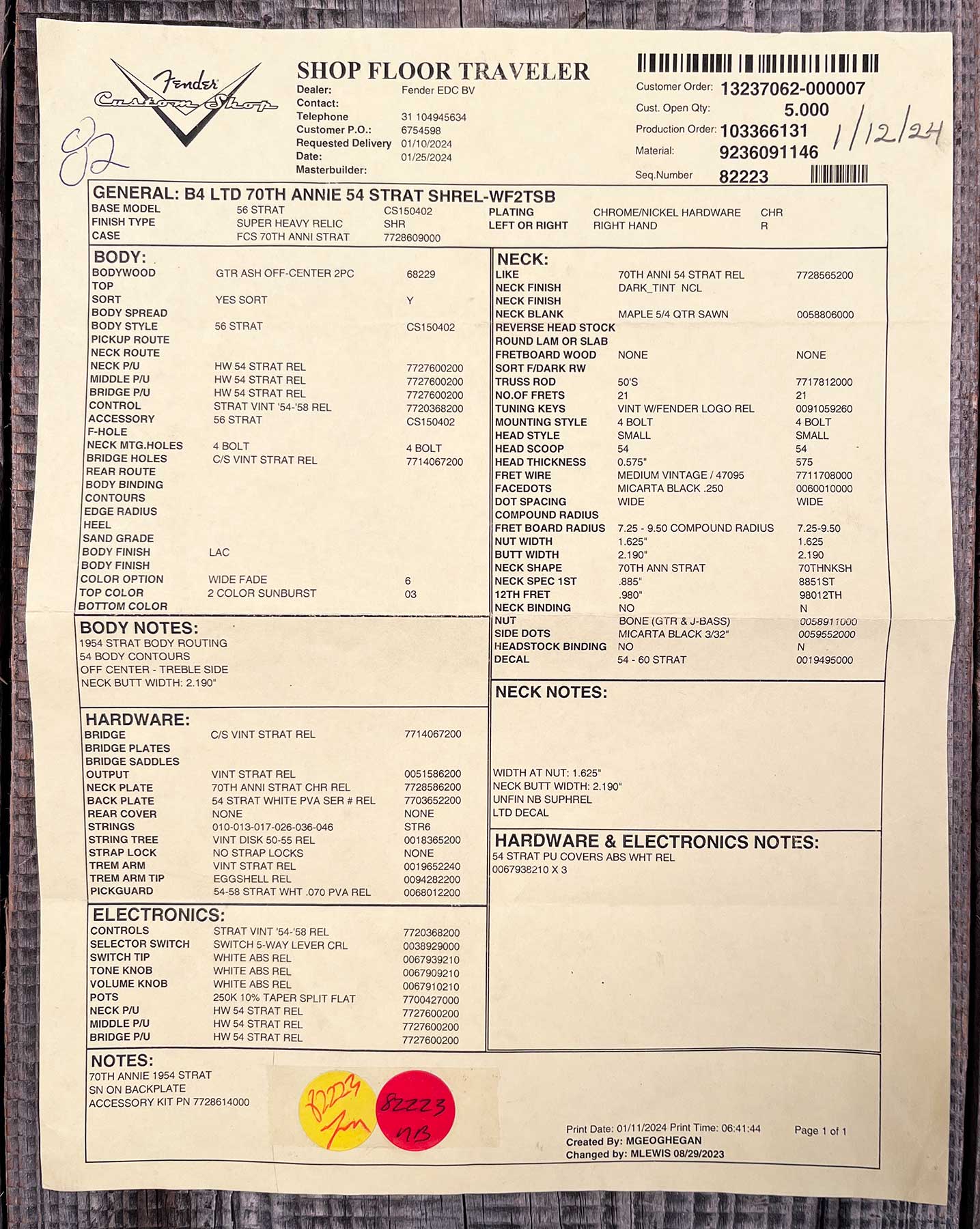 Elle est constituée d'éléments triés sur le volet : corps deux pièves en Frêne résonant (aigus musicaux, médiums feutrés, basses précises), manche et touche en Erable quarter-sawn (profil 07/54 Soft "V" basé sur une Stratocaster originale de juillet 1954, radius hybride 7.25" > 9.5", frettes Jescar médium-vintage), micros bobinés main Custom Shop hand-wound ’54 Strat, accastillage Custom Shop.
