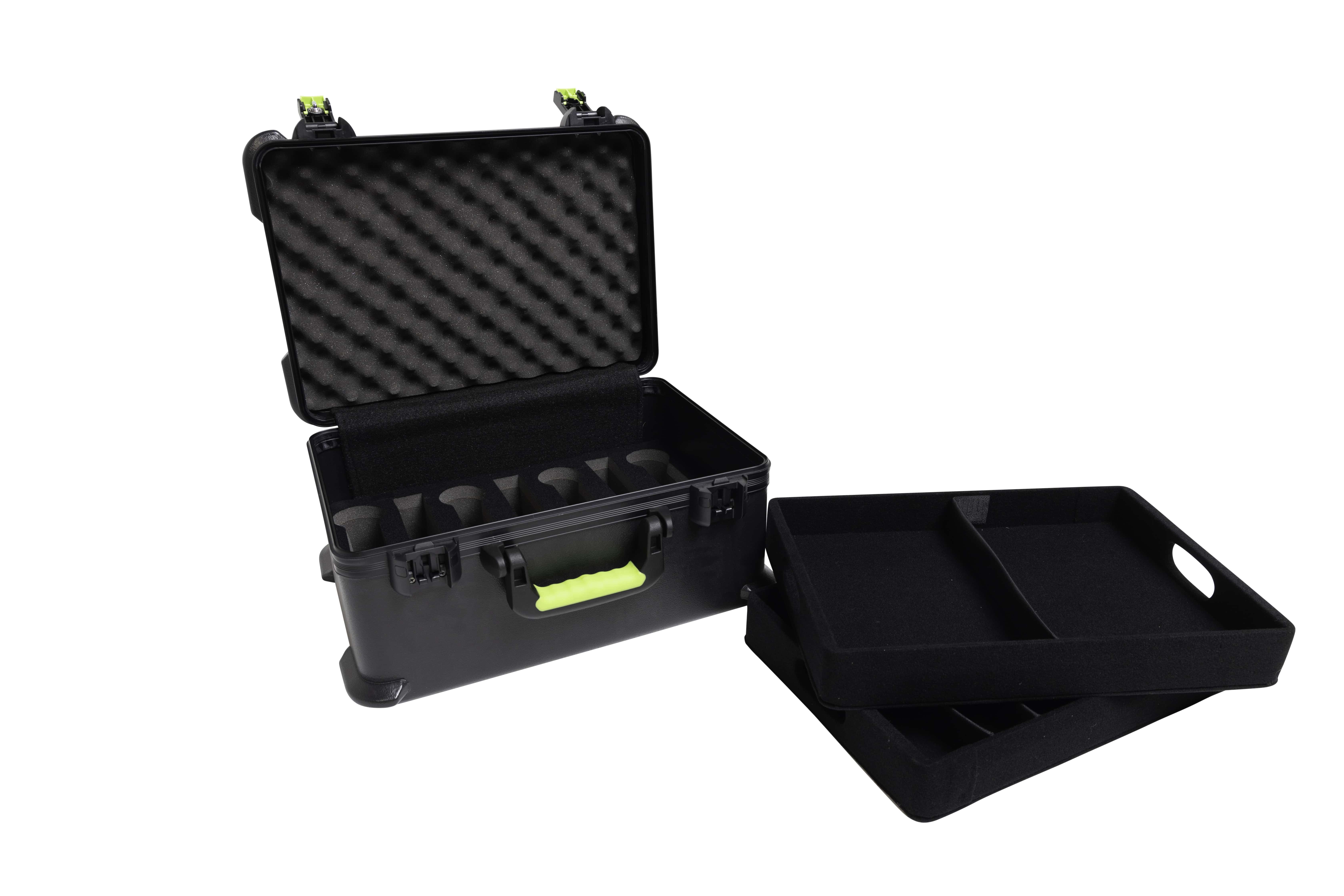 - Peut contenir jusqu'à 7 micros sans fil, avec des espaces de rangement pour les récepteurs, les émetteurs pocket et les accessoires.