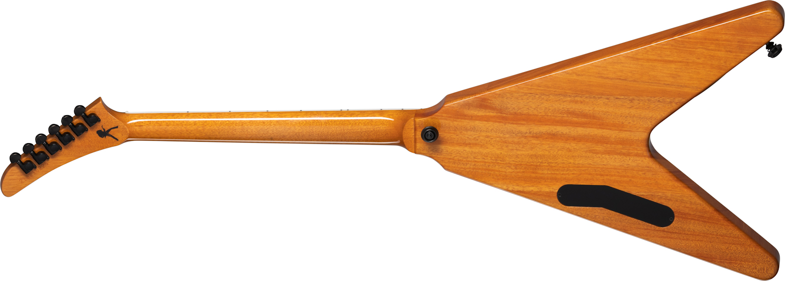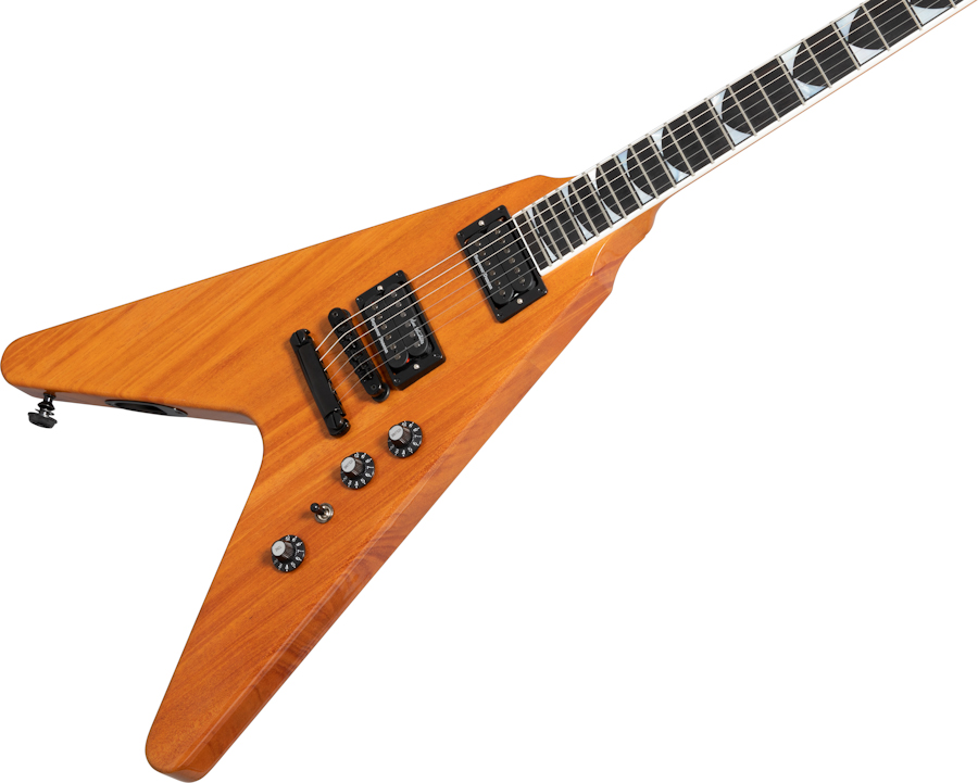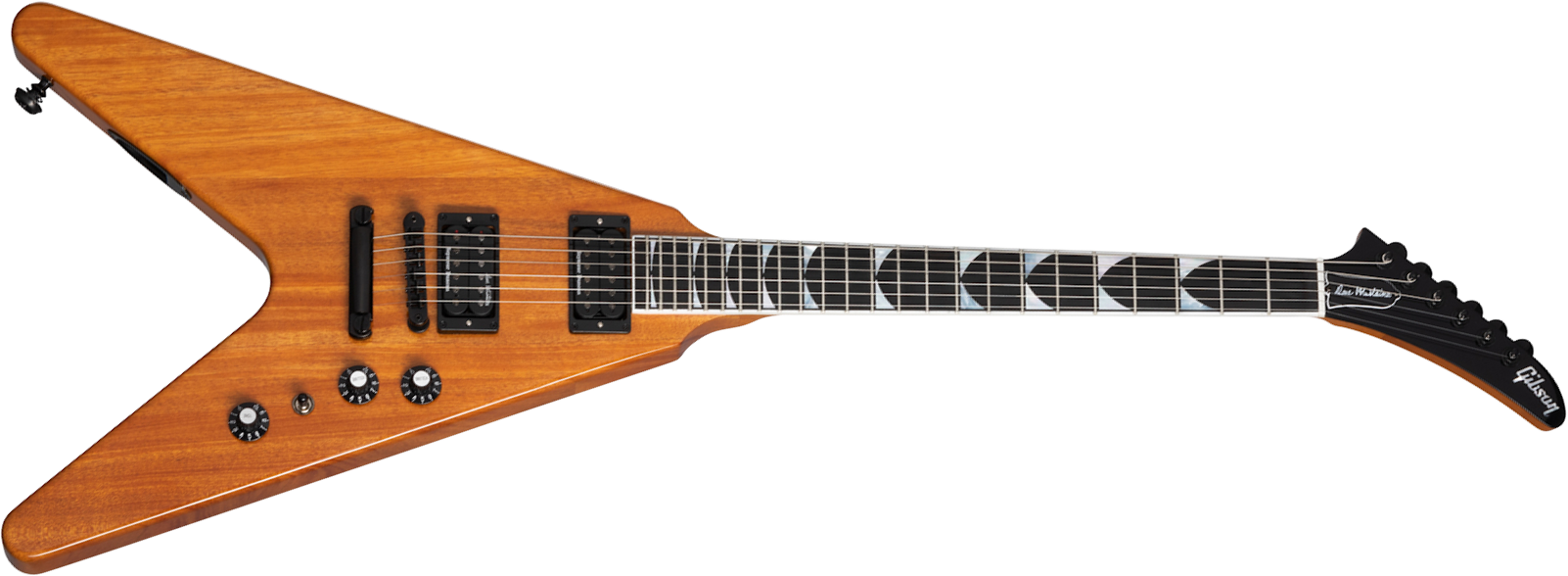 La GIBSON Dave Mustaine Flying V EXP (DSVX00ANBC1) coche toutes les cases du genre avec son design hybride (corps de Flying V, tête d'Explorer), sa lutherie traditionnelle (corps Acajou, manche collé Acajou), de plus inhabituelles 24 frettes et un set de micros Seymour Duncan Dave Mustaine Thrash Factor Signature qui comme on peut l'imaginer offre potentiellement des saturations rageuses et généreuses.