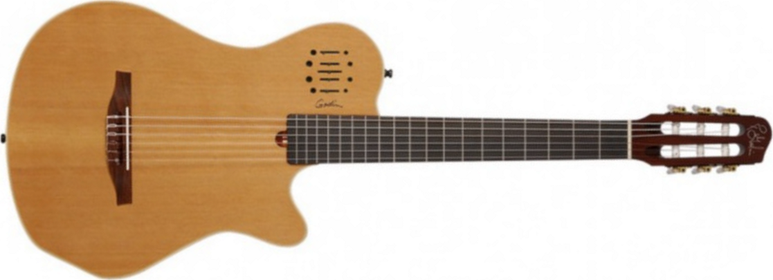 Munie d'une caisse en Acajou avec chambres tonales et table massive en Cèdre, la guitare cordes nylon électro GODIN Multiac Nylon Grand Concert Encore est un instrument hybride qui s'adresse aux musiciens habitués au contact d'une guitare classique (largeur de manche 5,08cm, radius 24"), mais qui veulent s'amplifier facilement en live ou studio.