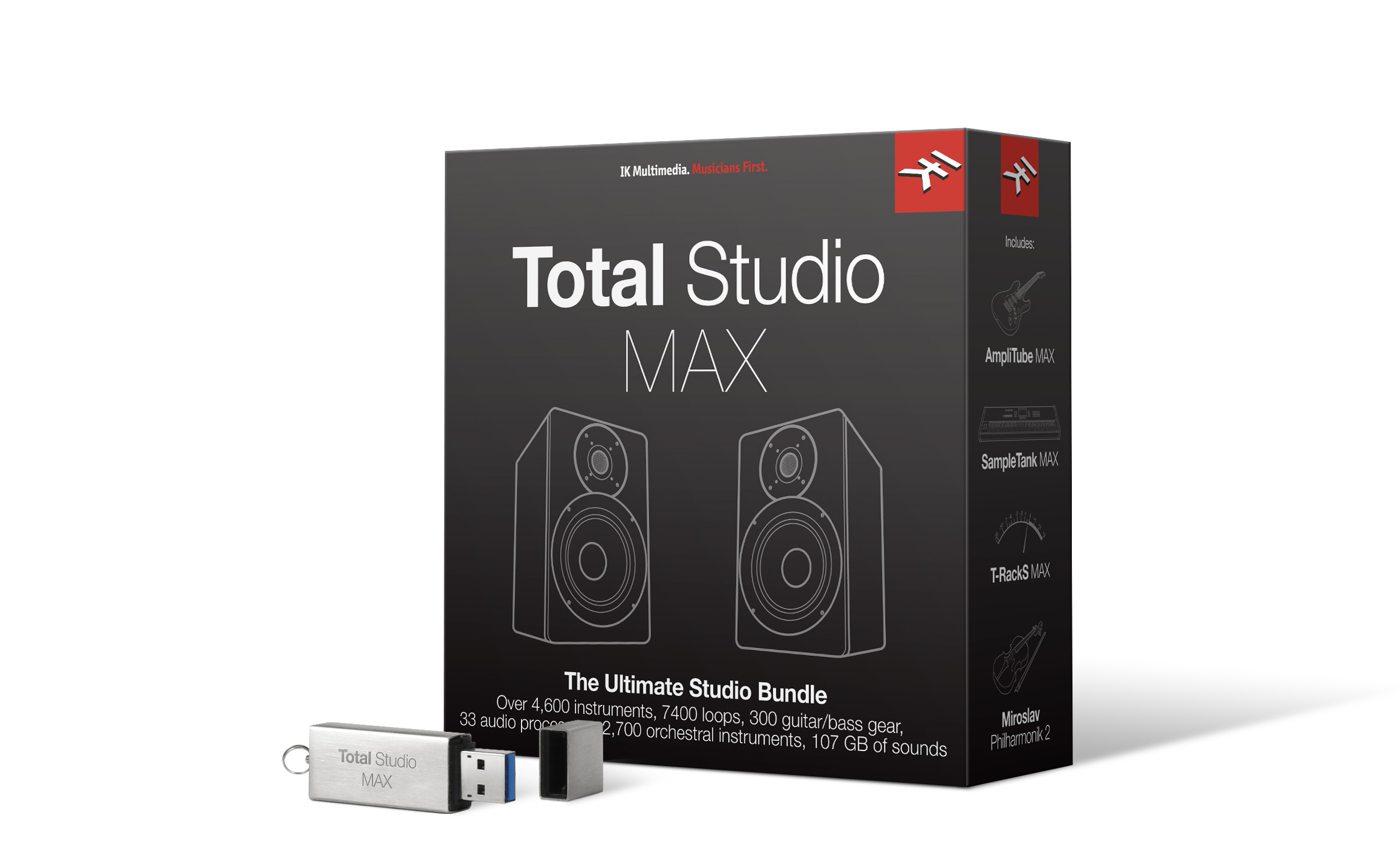 Le Bundle Total Studio Max d'IK Multimedia regroupe les logiciels AmpliTube MAX, T-RackS MAX, SampleTank MAX et Miroslav Philharmonik 2, soit tout ce dont vous avez besoin pour enregistrer, mixer, composer et masteriser vos projets musicaux.