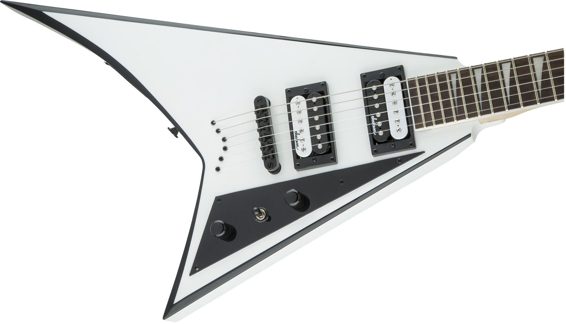 Inspirée d'un grand classique américain, agressive et ergonomique (profil de manche "Speed Neck"), la guitare électrique solid body pour gaucher JACKSON Rhoads JS32T (2910127577) plaira à tous les débutants Hard/Metal : caisse Peuplier, manche vissé Erable, touche Amaranthe 24 frettes, micros double bobinage Jackson High-Output Humbucking (aimants céramique), et chevalet fixe.