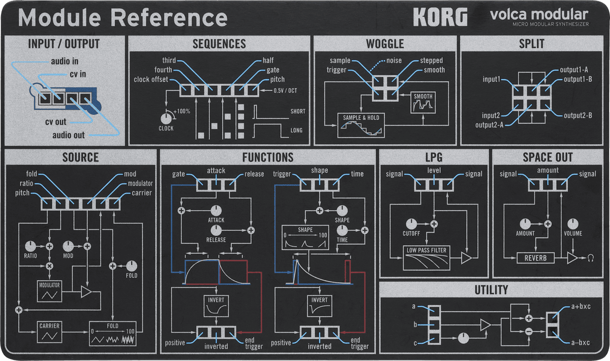 Les modules du Volca Modular sont reliés entre eux par les câbles patchs fournis, permettant une large variété de combinaisons. Le châssis compact du Volca Modular offre 50 entrées et sorties de patch. Celles-ci sont codées par couleurs pour une reconnaissance visuelle simplifiée, et les signaux sont également marqués par des symboles pour indiquer l'audio, le control, le gate ou le trigger. En principe, chaque signal est connecté en fonction de son utilisation, mais sur le Volca Modular, les niveaux de signal sont universellement compatibles entre les modules, multipliant largement les possibilités de patchs.