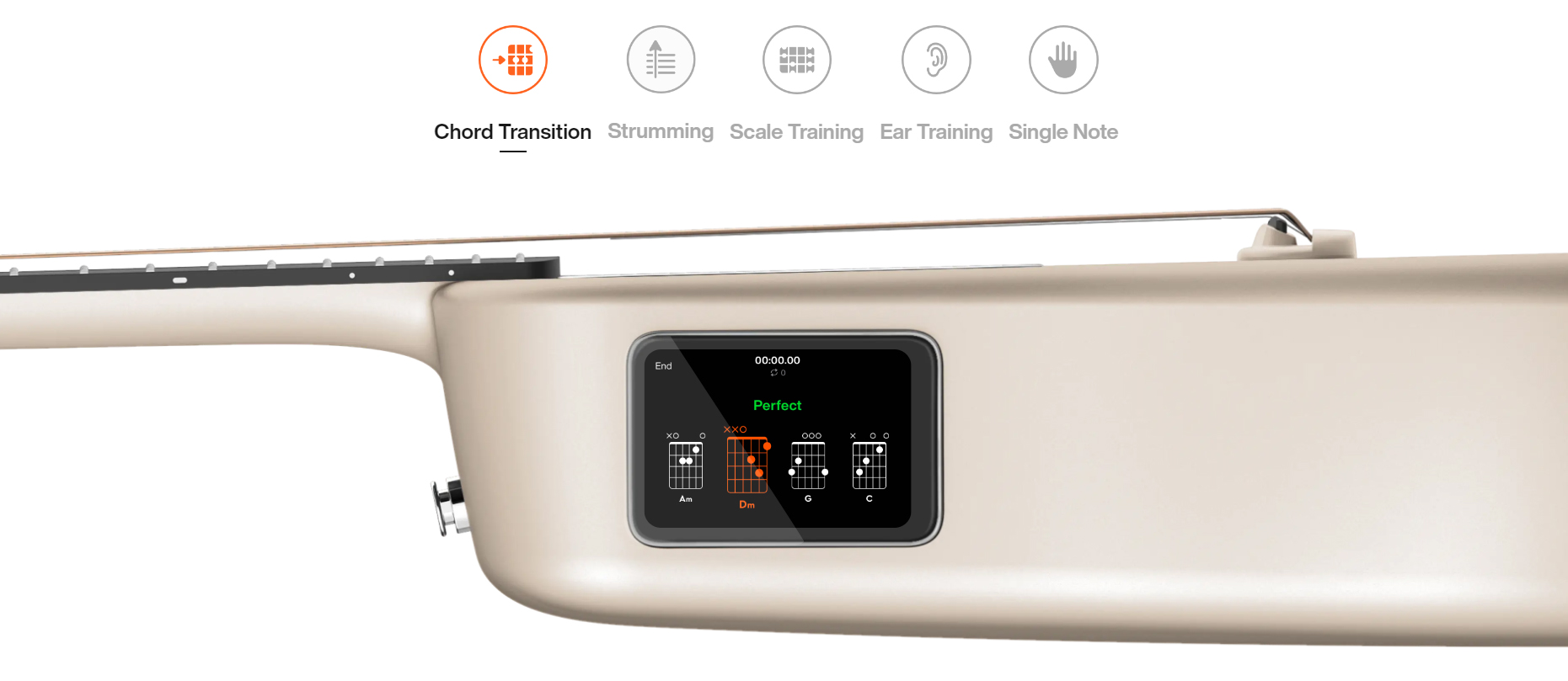 Concernant le système d'auto-amplification Freeboost : le fond de l'instrument agit comme un haut-parleur, et peut générer des effets de réverbération / délai / chorus contrôlables via des potentiomètres dédiés.