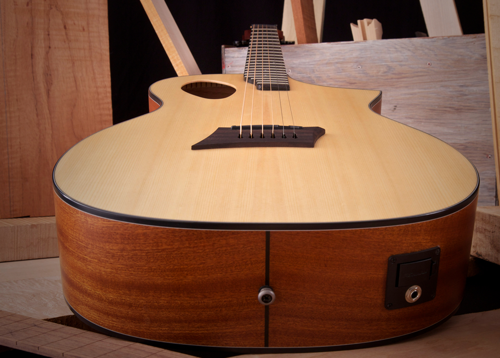 Constituée d'une table massive en Epicéa, d'un fond/éclisses en Sapele laminé, d'un manche en Acajou et d'une touche en Ovangkol, elle se distingue par son système de projection du son.