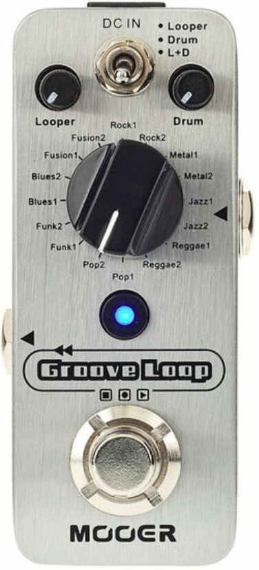 La micro pédale MOOER Groove Loop combine les fonctions de looper (20 minutes) et boîte à rythmes des pédales Micro Loop et Micro Drummer, avec la possibilité de les activer indépendamment ou simultanément (le looper se synchronise automatiquement au preset de batterie utilisé en parallèle de la section "drummer").