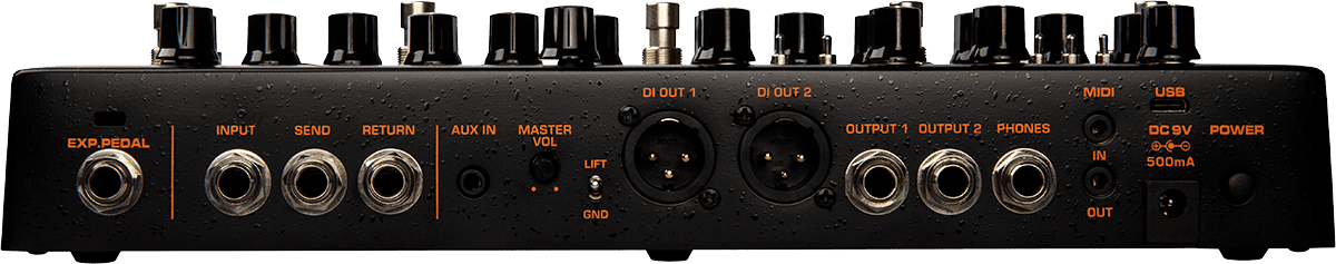 - Entrées : Pédale d'expression, Instrument jack, Auxiliaire mini jack, FX Loop return
