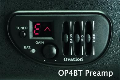 Pour ce qui est de la pré-amplification, un Ovation OP-4BT offre des contrôles de volume, gain, et une égalisation 3 bandes, ainsi qu'un accordeur et une LED témoin d'usure de la pile.