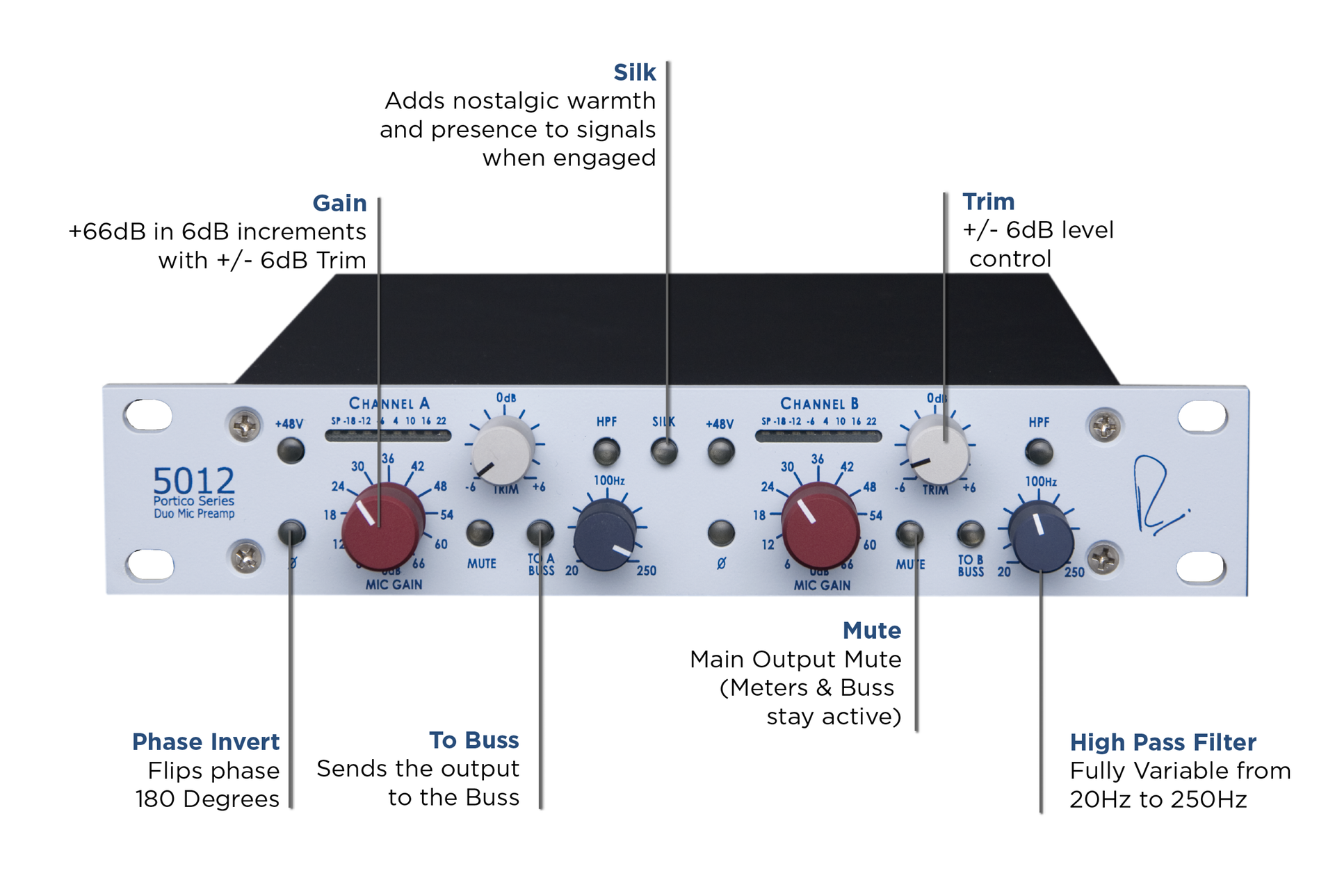 - Fonction « Silk » : Le Rupert Neve 5012 utilise principalement des circuits à transformateurs monofaces qui excluent tout risque de distorsion. Le bouton « silk » ajuste le spectre des fréquences et délivre un son extrêmement doux et musical.