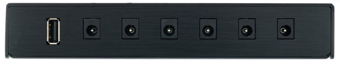 - 6x sorties 9VDC (capacité de charge de 100 mA pour chaque, fiches cylindriques 2,1 x 5,5 mm, polarité négative à l'intérieur)