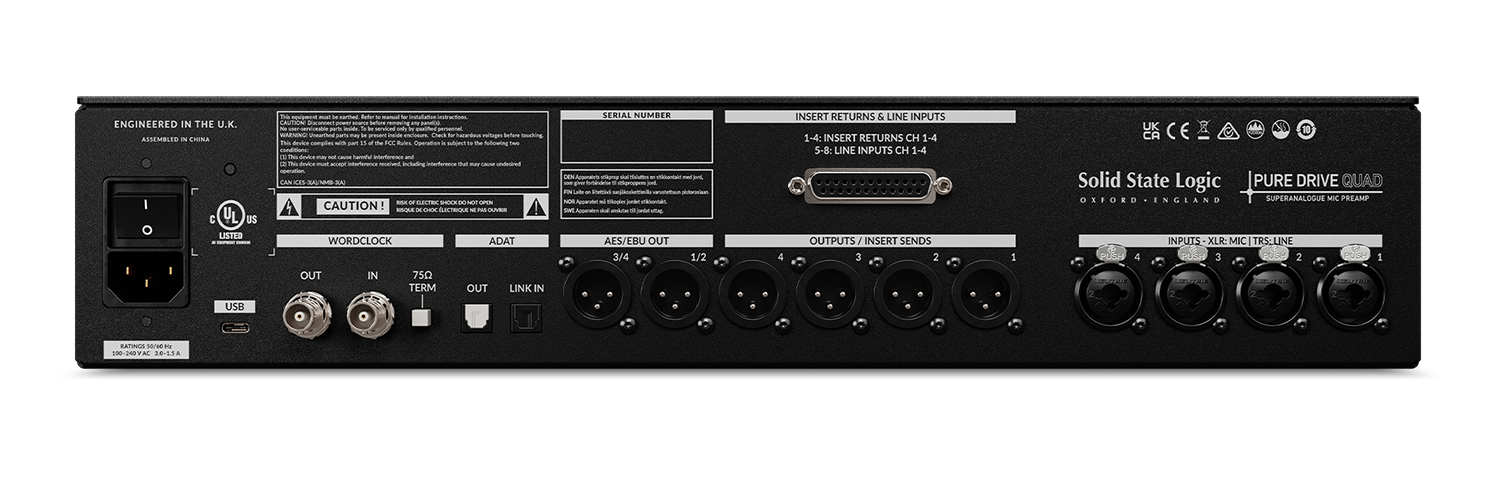 Le Pure Drive Quad dispose de quatre entrées combo XLR/jack installés sur le panneau arrière, de quatre entrées instrument Hi-Z/DI en façade avec détection automatique de signal, et de trois connecteurs D-Sub pour les entrées ligne, ainsi que des envois et retours d'insert. Les retours d’insert et les entrées à conversion analogique vers numérique opèrent jusqu’à +24 dBu au niveau ligne, pour s’interconnecter directement avec d’autres équipements professionnels.