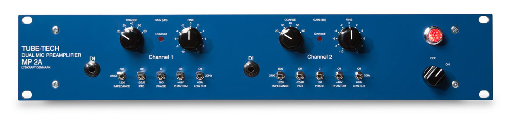 Le Tube-Tech MP2A combine un double préampli micro et une double boîte de direct pour instruments. Les entrées sont accompagnées d'une alimentation fantôme +48 V débrayable et d'un sélecteur d'impédance d'entrée permettant de choisir entre 600, 1200 et 2400 ohms. Elles sont aussi équipées d'un inverseur de phase, d'un filtre coupe-bas (Off, 20 ou 40 Hz) et d'un atténuateur -20 dB. Le gain est réglable de +10 à +70 dB par pas de 10 (Coarse) et 2 dB (Fine). Les entrées directes pour instrument sont asymétriques avec un niveau de gain de +10 à +60 dB. L'amplification est entièrement à lampes. Le transformateur d'entrée est logé dans un compartiment isolant en Mu-métal. Les transformateurs d'entrée et de sortie sont équipés d'un blindage statique. Les entrées et sorties sont symétriques et entièrement flottantes.