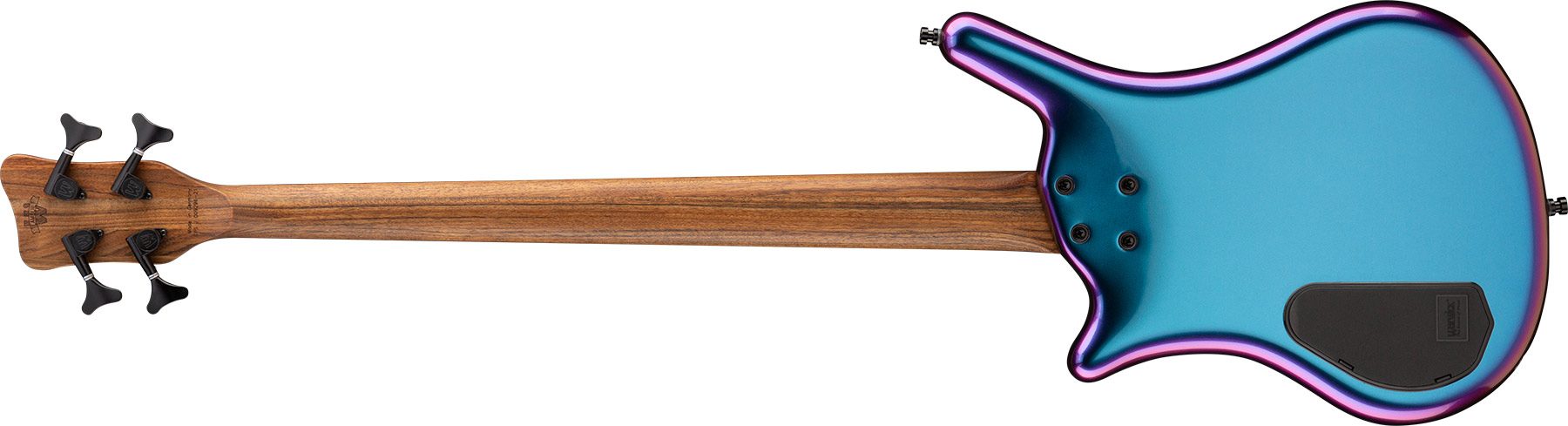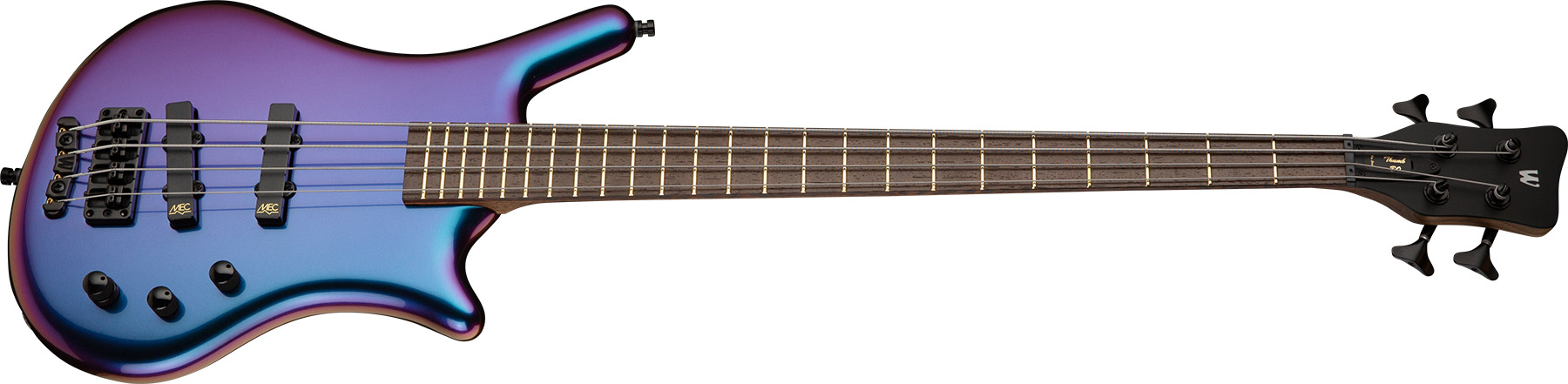 Corps Ovangkol, manche vissé Ovangkol, touche Wenge 24 frettes, micros actifs MEC J/J avec pré-ampli actif Warwick 2-way Electronics.