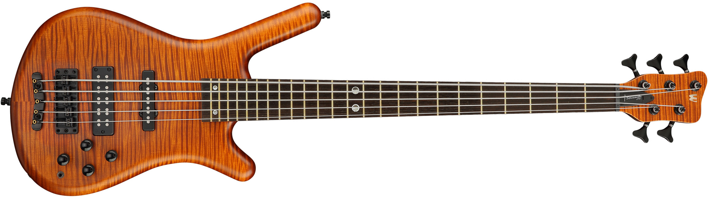 Elle constituée d'une caisse ergonomique en Etimoe rehaussée d'une splendide table en Erable flammé 4A, d'un manche vissé cin pièces en Wenge/Etimoe avec touche Wenge 24 frettes (Invisible Fret Technology), de micros Nordstrand Dual Coil Soapbar / Style J et d'une électronique active trois bandes Warwick.