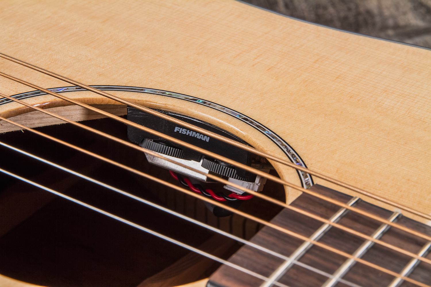 - Système Fishman Sonitone (curseurs de volume et tonalité sur la bordure interne de la rosace).